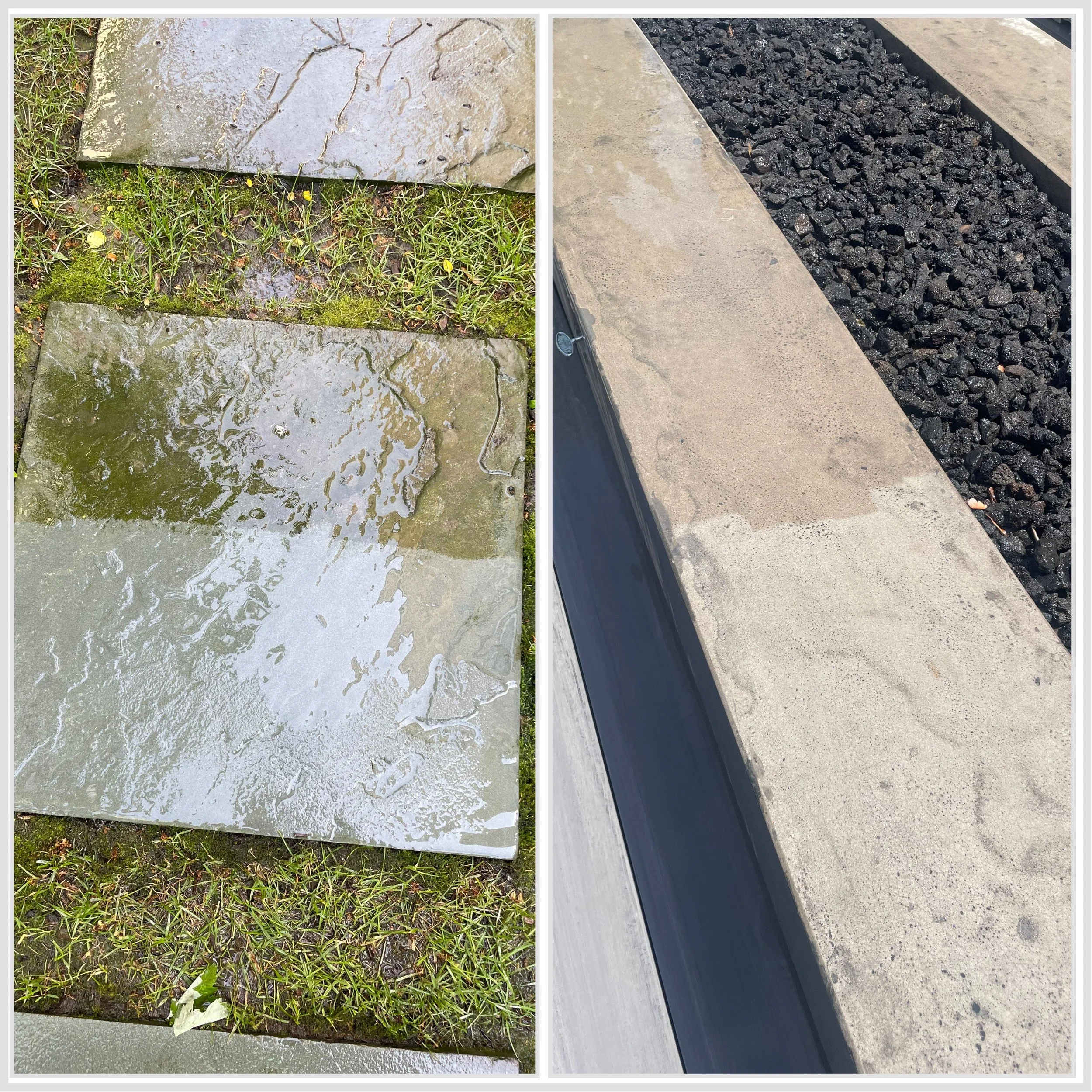 Comparison of two concrete surfaces; the left side shows wet, mossy, and cracked stone slabs on grass, the right side shows dry, smooth, and black asphalt gravel alongside a concrete curb.