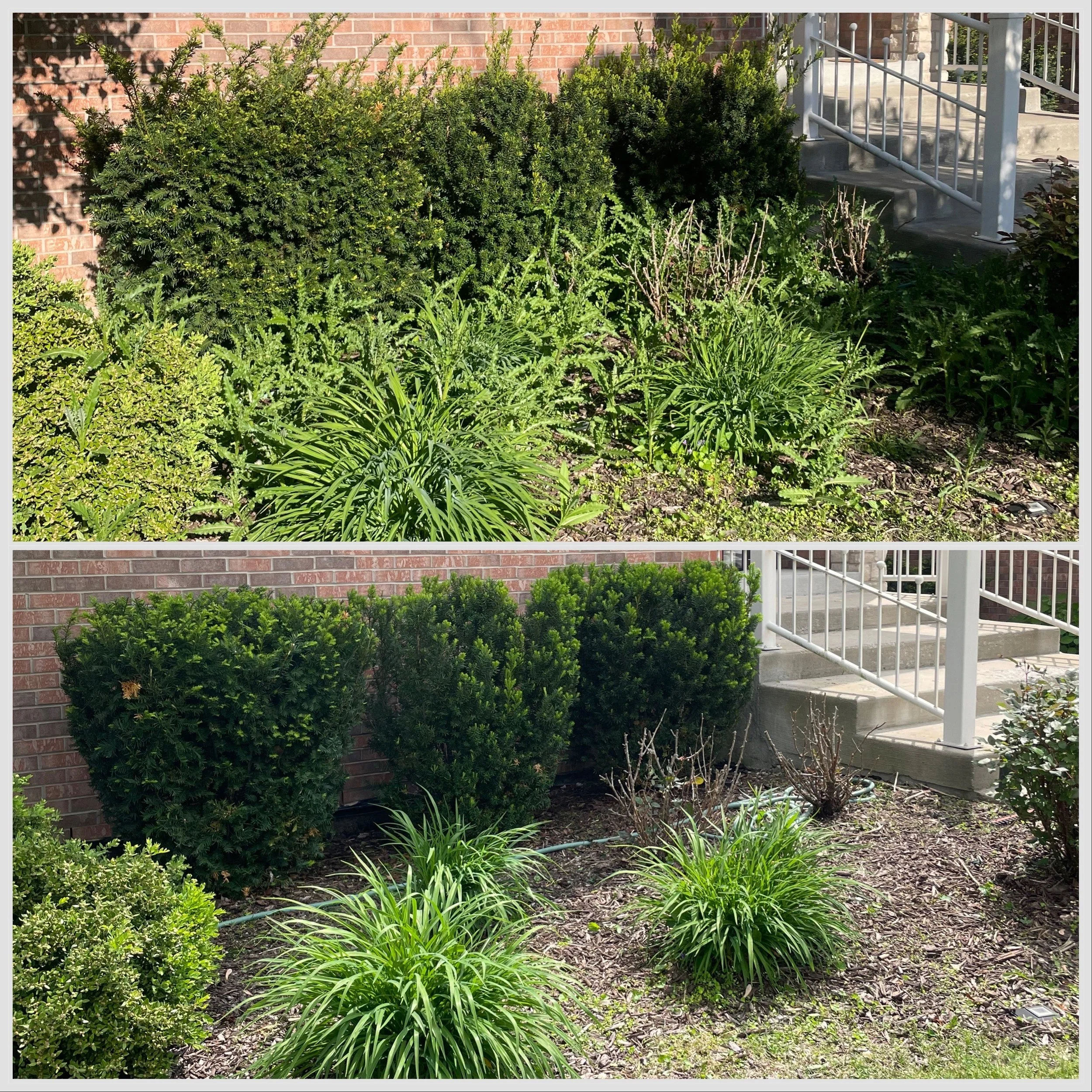 Comparison of a garden before and after trimming. The top image shows overgrown bushes and weeds, while the bottom image shows neatly trimmed bushes and organized garden bed.