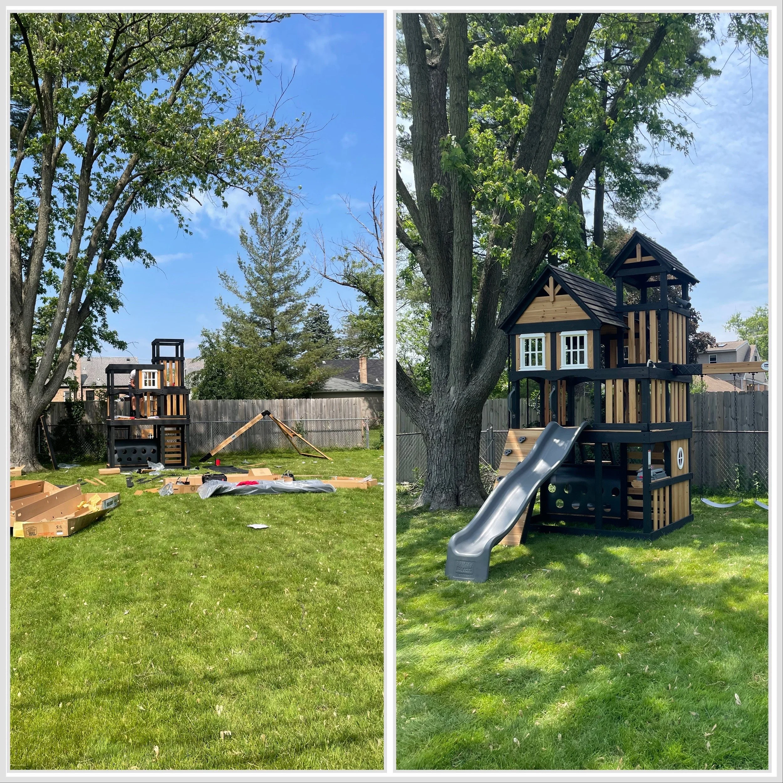 Comparison of a backyard playground under construction on the left and fully assembled on the right, featuring a multi-level wooden playhouse, slide, and rope bridge.