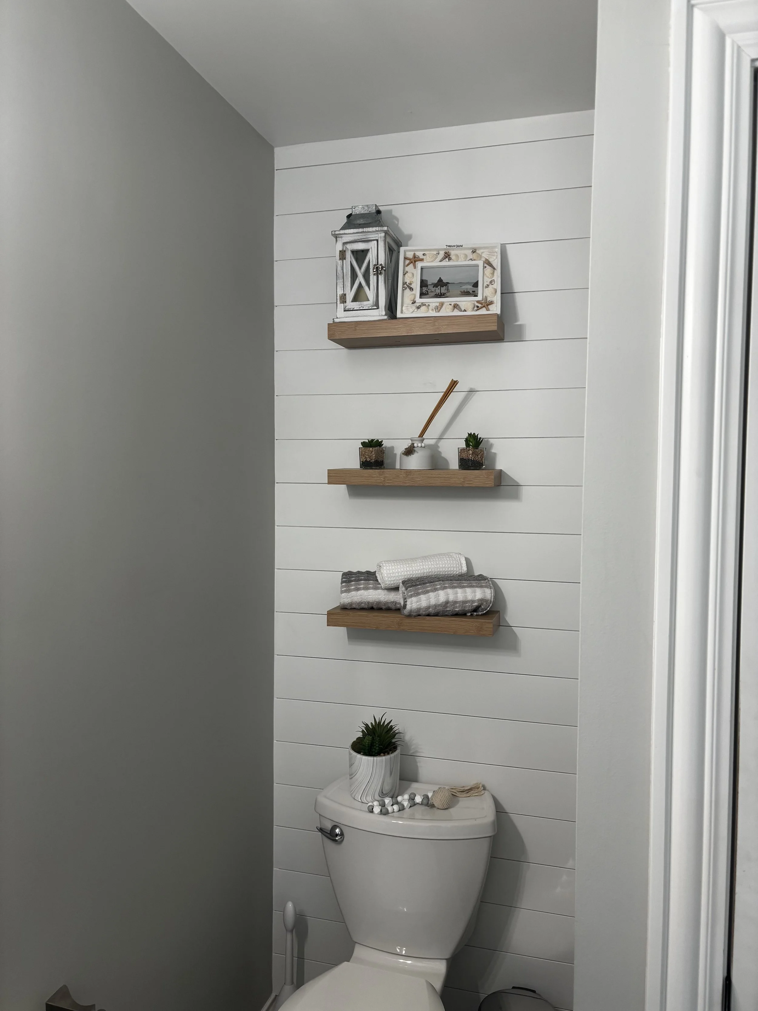 Bathroom with white shiplap wall, decorated with wooden shelves holding small potted plants, towels, and decorative items, above a white toilet with a small potted plant on top.