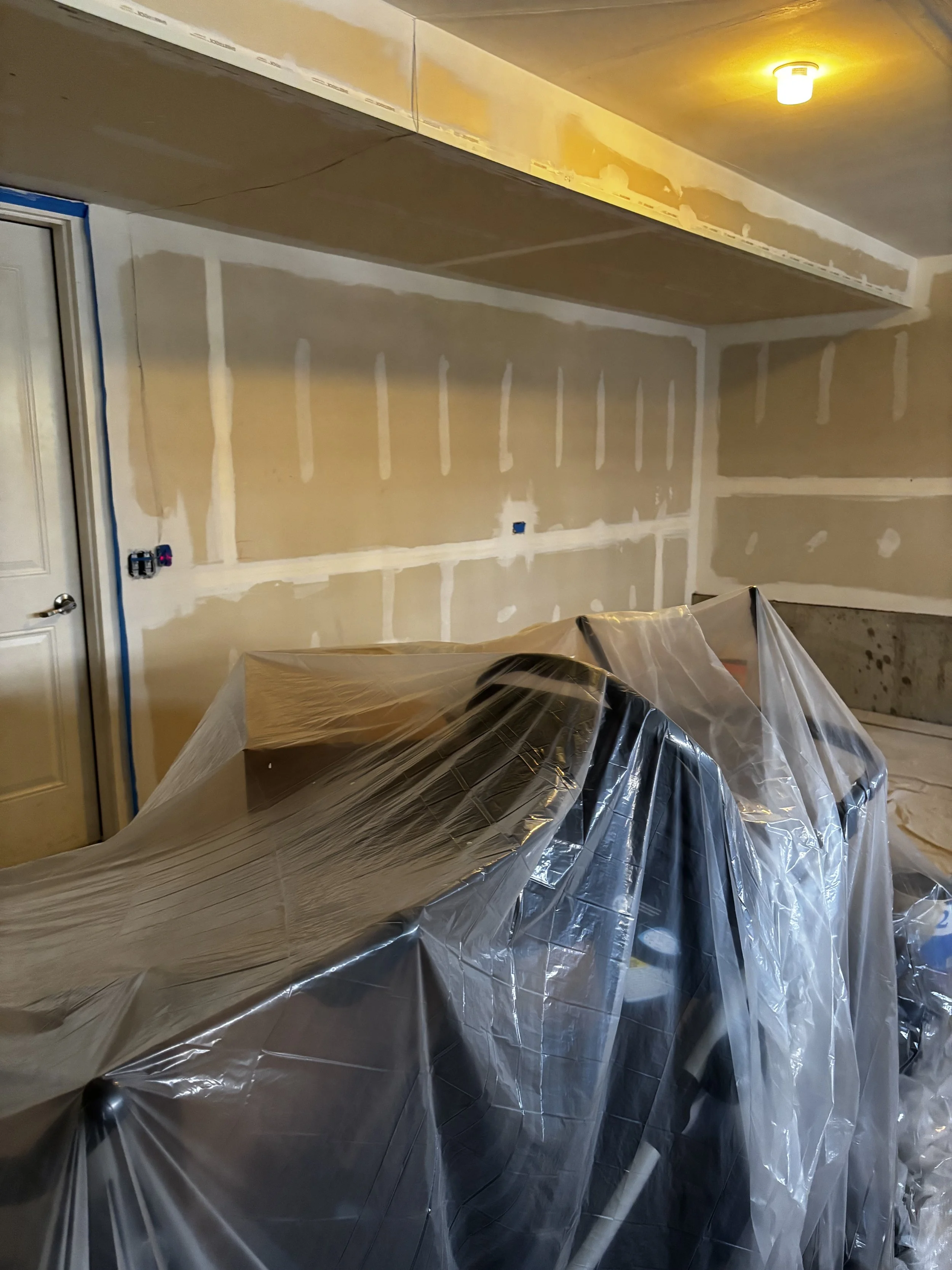 Room under renovation with drywall walls partially finished, tools covered with plastic sheeting, and a ceiling light turned on.