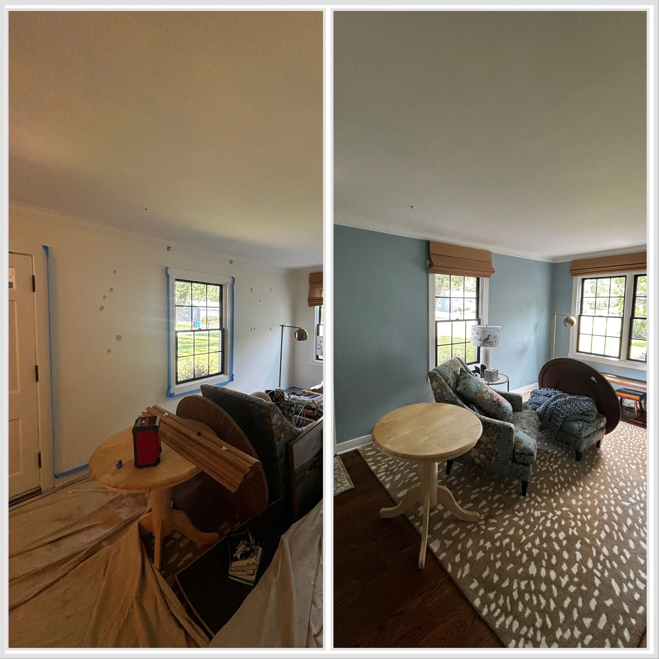 Comparison of a living room before and after painting. The left side shows the room with walls prepped and taped for painting, with visible patches and construction materials. The right side displays the finished room with light blue walls, decorated