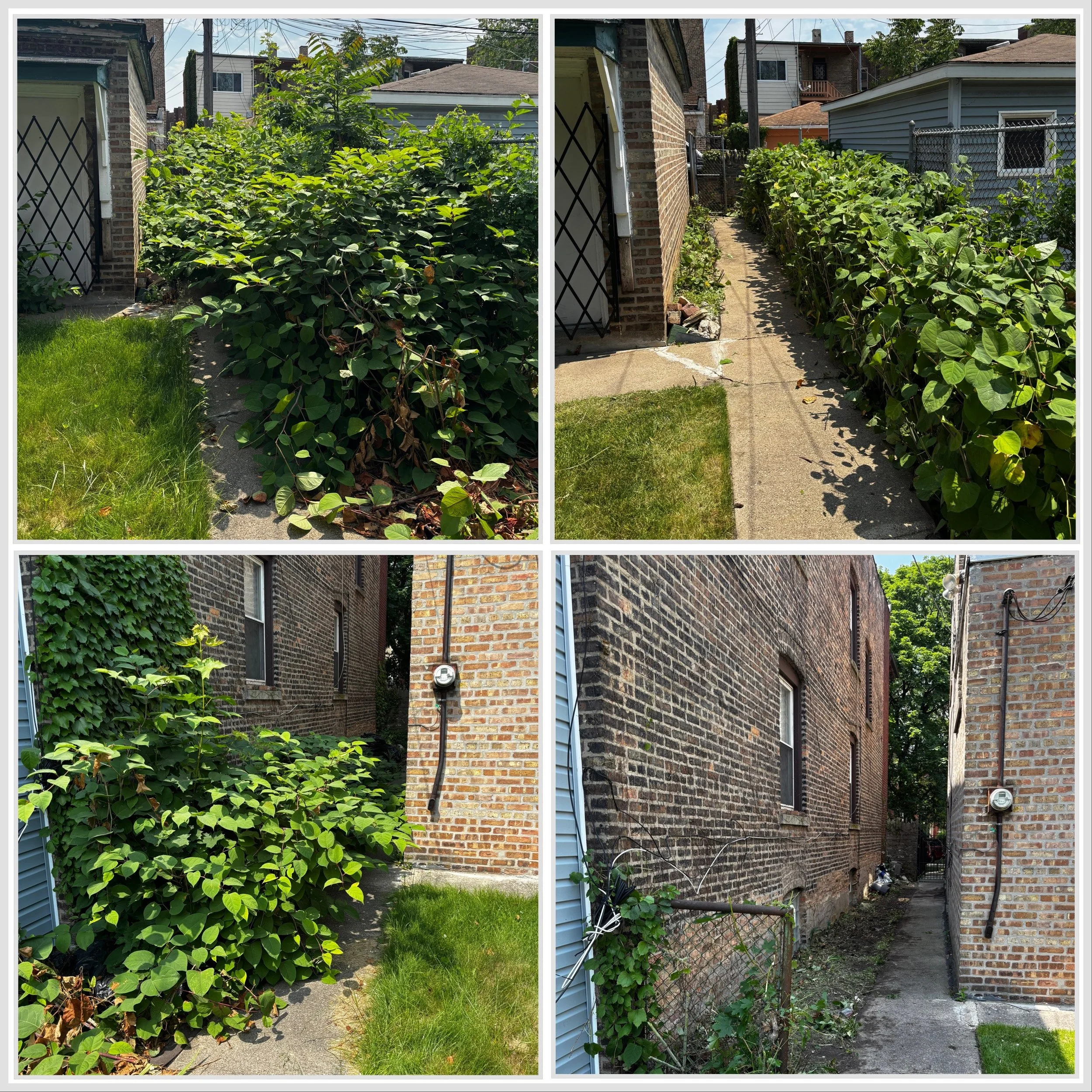 A collage of four images showing overgrown weeds and shrubs along the side of a building and a narrow alleyway, with some bricks and fences visible, indicating an unkempt backyard or walkway area.